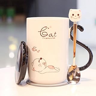 Ldhome Tendance Créative Belle Tasse en Céramique Tasse Mug avec Cuillère Couvrir La Tasse De Café De Petit-Déjeuner De l'eau Cadeau Étudiant Fille Verre 400Ml Coaster Chat Blanc