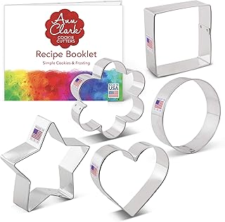 Ann Clark Cookie Cutters Ensemble de 5 emporte-pièces basiques avec livret de recettes, étoile, cœur, cercle, fleur et carré