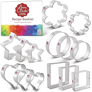 Ann Clark Cookie Cutters Ensemble de 14 emporte-pièces basiques avec livret de recettes, ensemble basique d’emporte-pièces avec carte de recette, étoile, cœur, cercle, fleur, carré