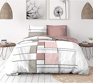 COUETTES ET CETERA Parure de Couette 3 pièces Le Géométrique Housse de Couette - Percale de Coton 80 Fils- 2 Personnes - Rose/Beige/Blanc (220_x_240_cm)