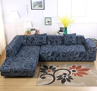 JIAN YA NA L Forme Extensible Canapé Covers Polyester Spandex Housse Polyester Tissu Stretch Slipcovers + 2pcs Oreiller Housses pour Canapé Canapé (Bleu (Feuilles)) Bleu (Feuilles)