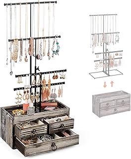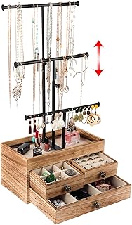 Présentoir à Bijoux en métal avec boîte de Rangement en Bois, 3 tiroirs et Hauteur réglable pour Boucles d'oreilles, Colliers, bagues et Bracelets, Bois Rustique